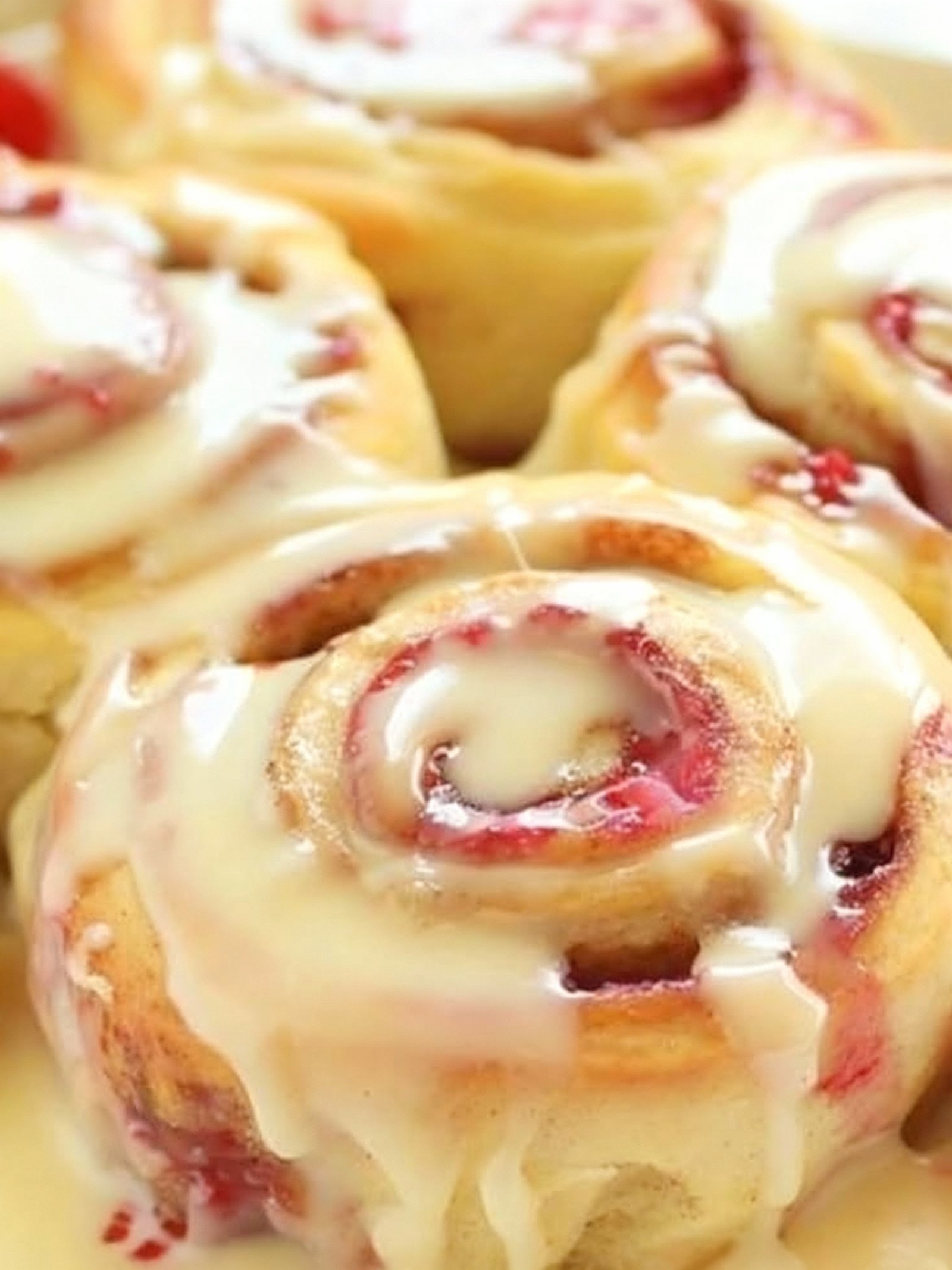 Soft and sticky cinnamon rolls filled with juicy raspberries and topped with a tangy lemon glaze, combining the warmth of cinnamon with fresh raspberry and bright lemon flavors.