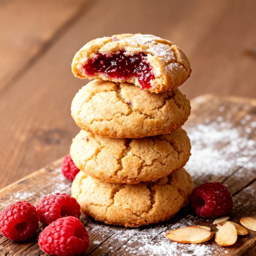 These Raspberry Filled Almond Snow Cookies combine buttery almond dough with sweet-tart raspberry filling, creating a delicate treat with a soft crumb and festive powdered sugar coating.