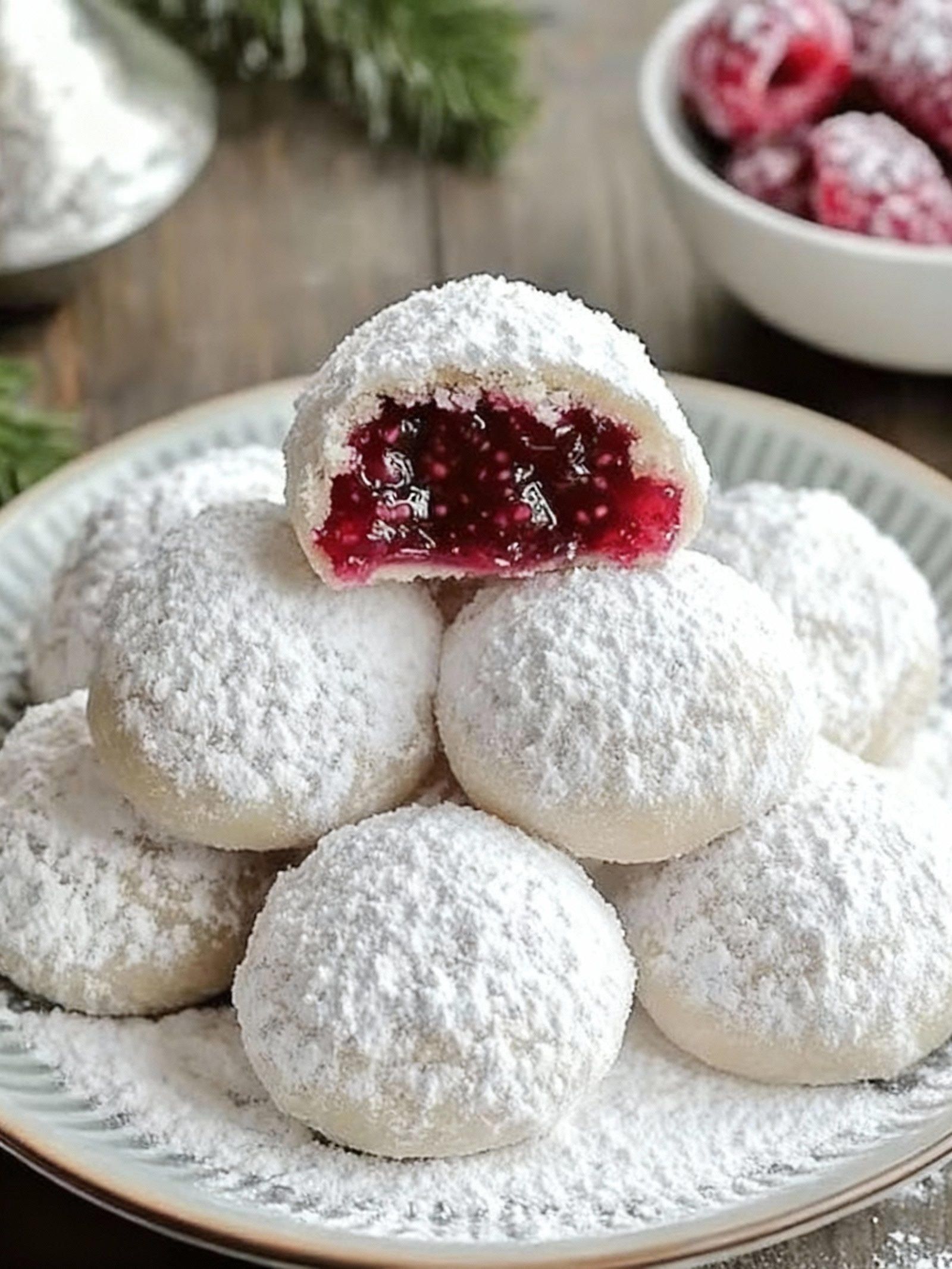 Buttery almond snowball cookies filled with sweet raspberry jam and rolled in powdered sugar for a festive, melt-in-your-mouth treat.