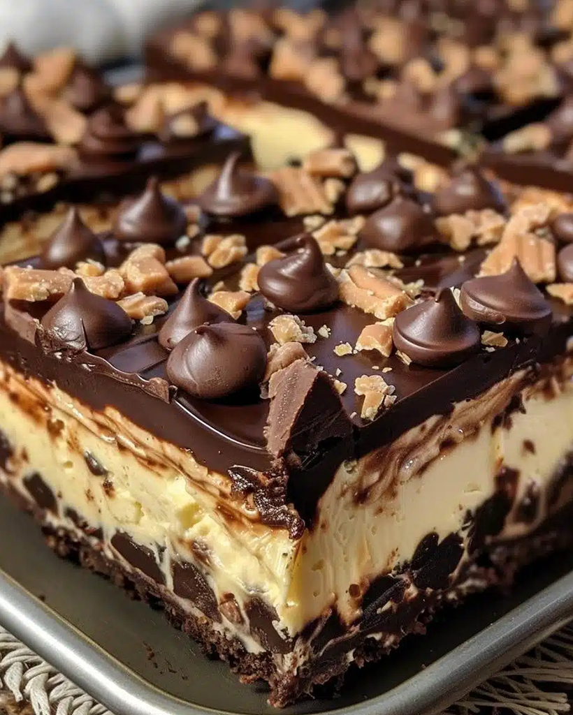 Reese’s Butterfinger Cheesecake Bars are a beautiful testament to American ingenuity in the kitchen. They emerge from a long tradition of no-bake desserts that became a staple in busy households, especially across the Midwest and South. While cheesecake itself has deep European roots, this particular version is a purely stateside creation, born from the post-war era’s love affair with convenience and brand-name candies. Families have been crushing up their favorite chocolate bars and swirling them into creamy fillings for generations, often for potlucks or church socials where a crowd-pleasing dessert was mandatory.