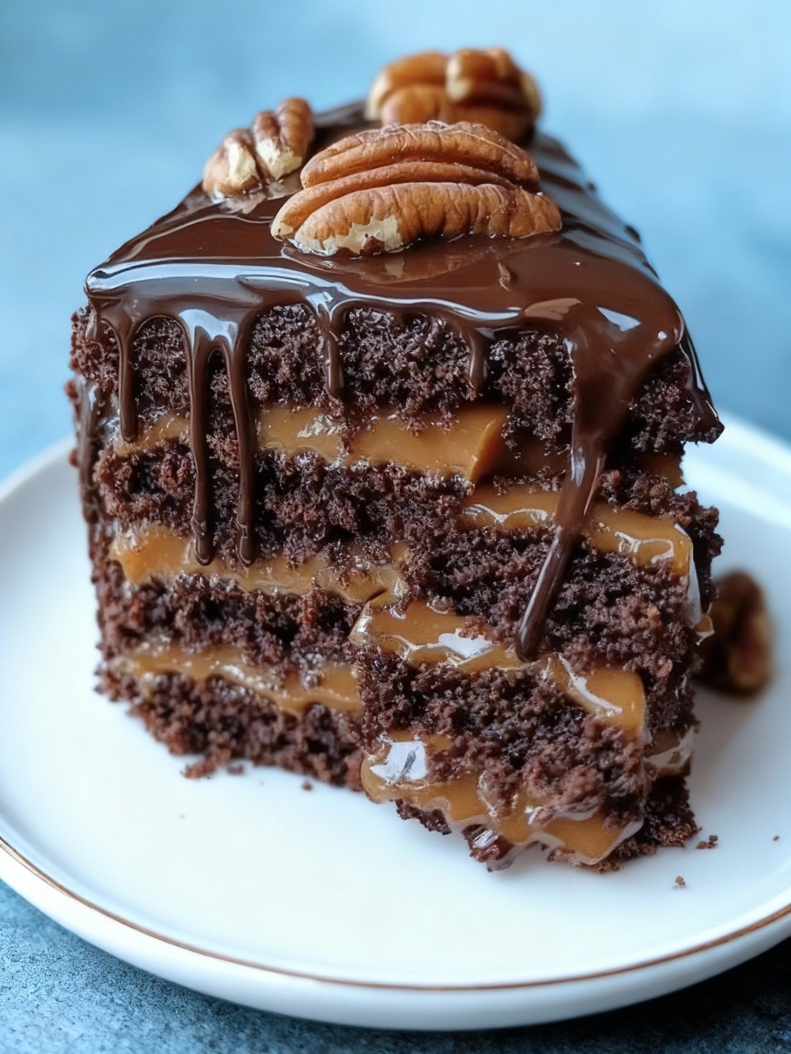Always let the cake come to room temperature before serving for the best texture and flavor from the chocolate, caramel, and pecans in every bite.