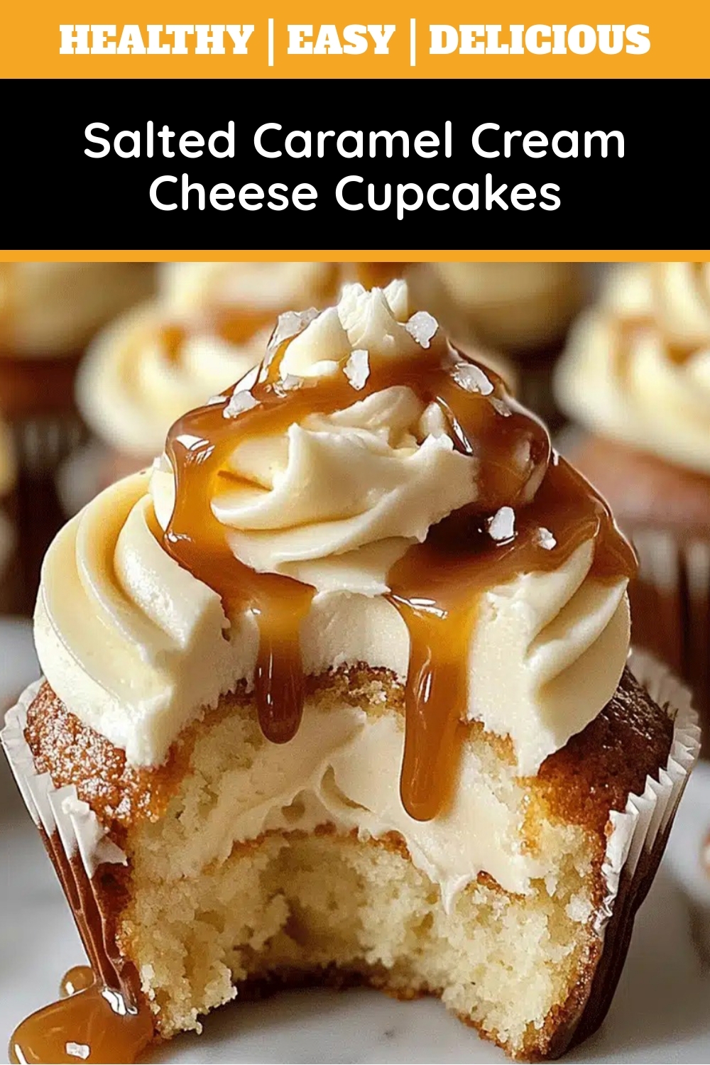 Decadent vanilla cupcakes filled with a creamy caramel cream cheese center and topped with salted caramel frosting.