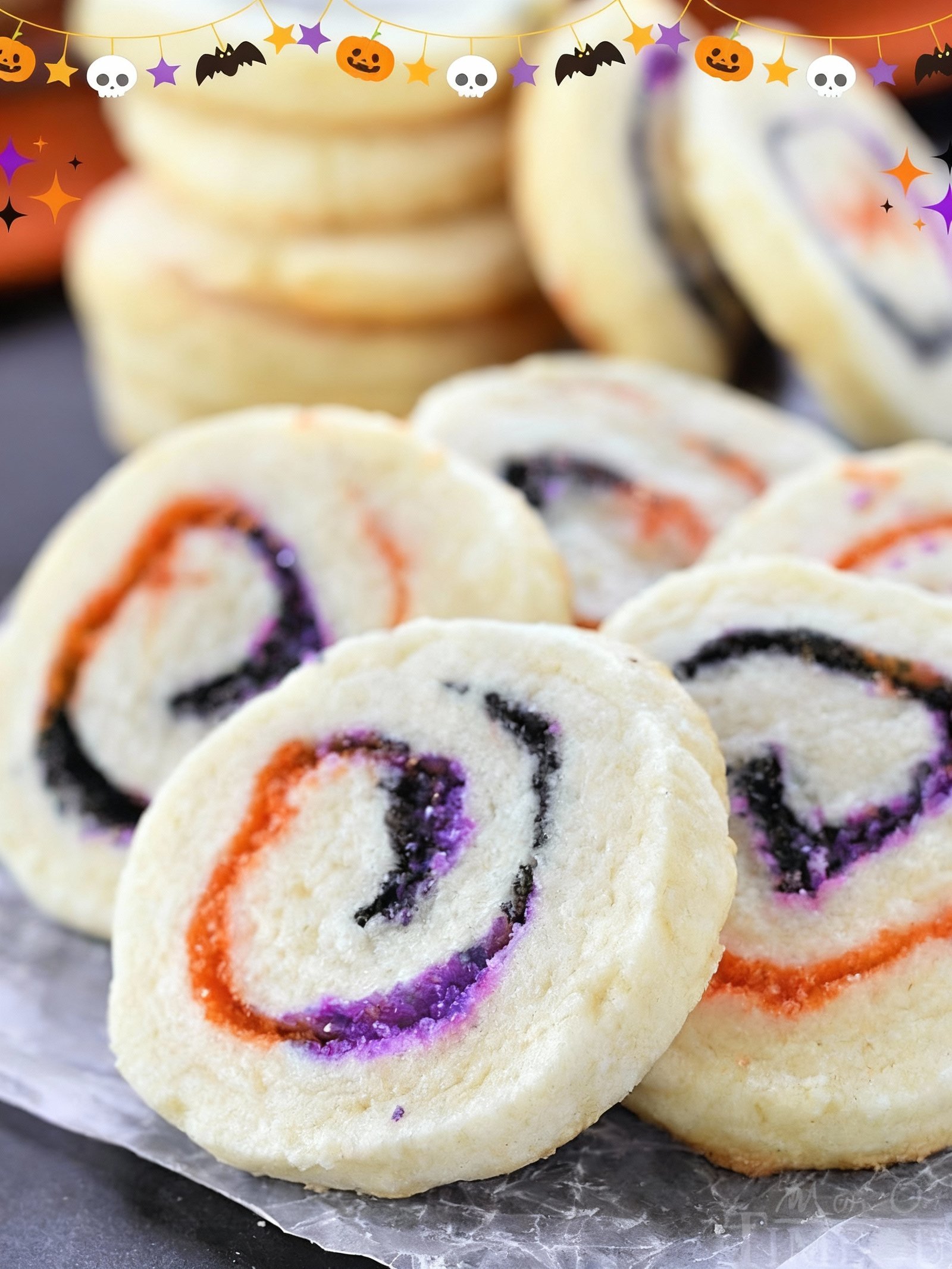 These fun and festive spiral Halloween cookies make excellent edible decorations when placed around your Halloween dessert table or used to garnish plates of other sweet treats.