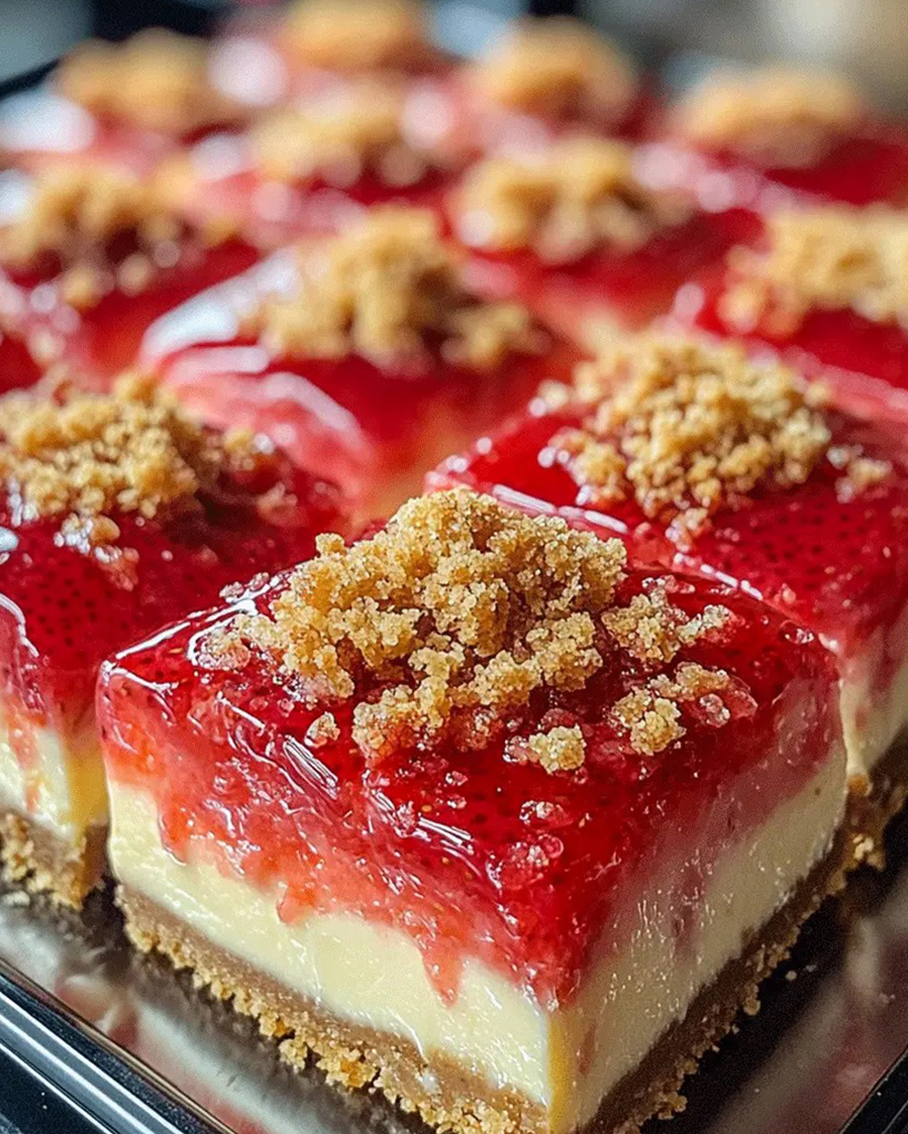 Delicious bite-sized cheesecake treats with a strawberry crunch topping.