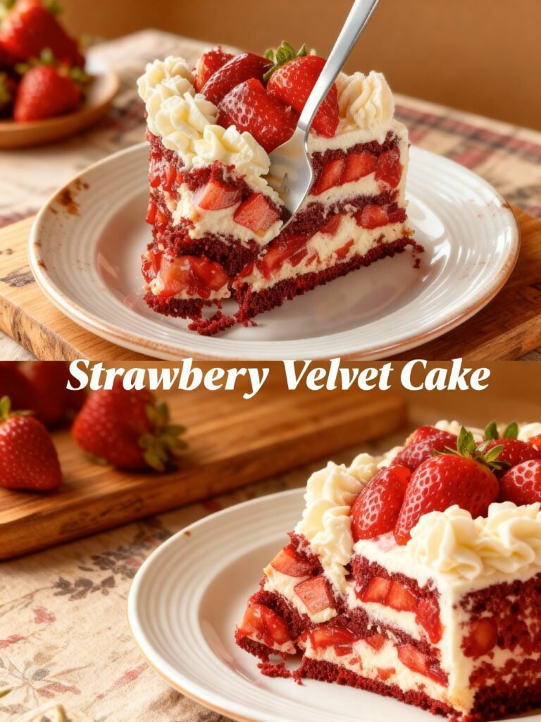 This Strawberry Velvet Cake delivers a stunning deep red color with a moist, tender crumb and rich chocolate undertones, perfectly complemented by a sweet strawberry frosting.