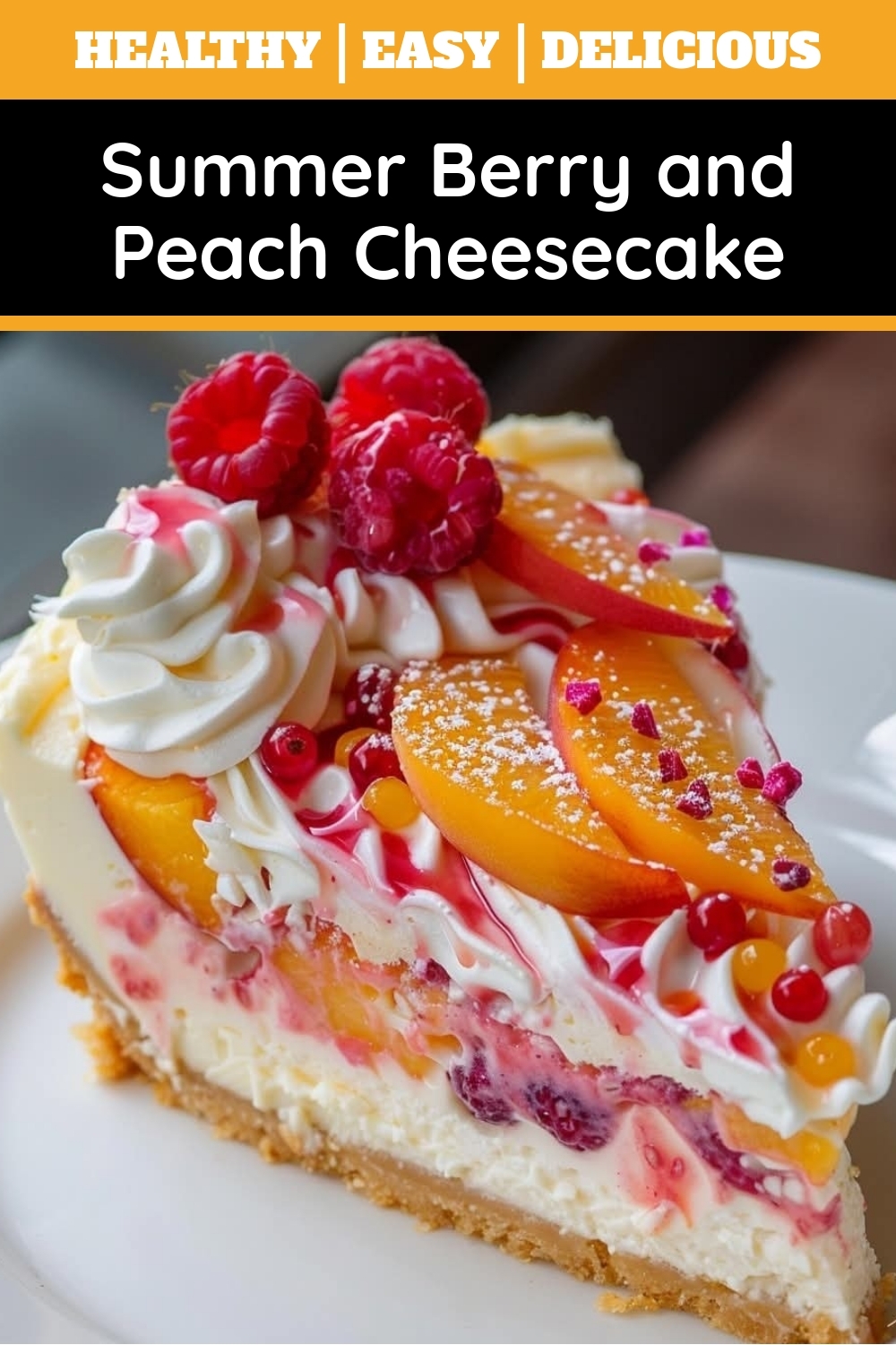 Summer Berry and Peach Cheesecake deserves a show-stopping presentation to match its vibrant flavors. For a stunning look, top each slice with fresh peach slices and a handful of mixed berries like raspberries, blueberries, or blackberries. A light dusting of powdered sugar or a drizzle of honey adds a touch of elegance. Alternatively, serve it on a decorative cake stand for a centerpiece-worthy dessert at summer gatherings or brunches.