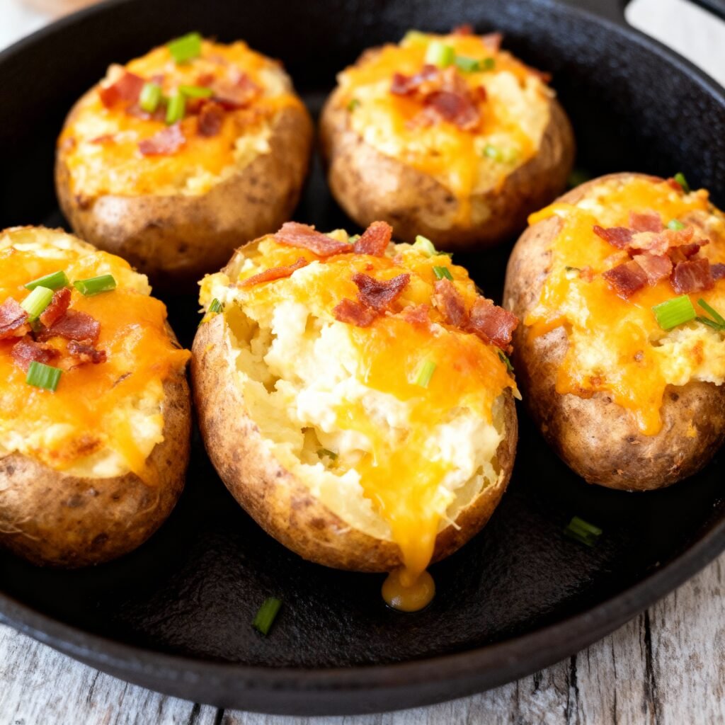 Context: This twice baked potatoes recipe is about 20% faster than similar recipes thanks to streamlined preparation steps.