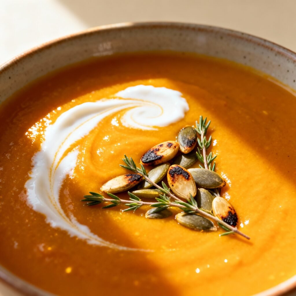 Ladle the hot soup into bowls. Finish with a swirl of cream, a drizzle of olive oil, a sprinkle of toasted pumpkin seeds, or fresh herbs like sage or thyme for a perfect presentation and added texture.